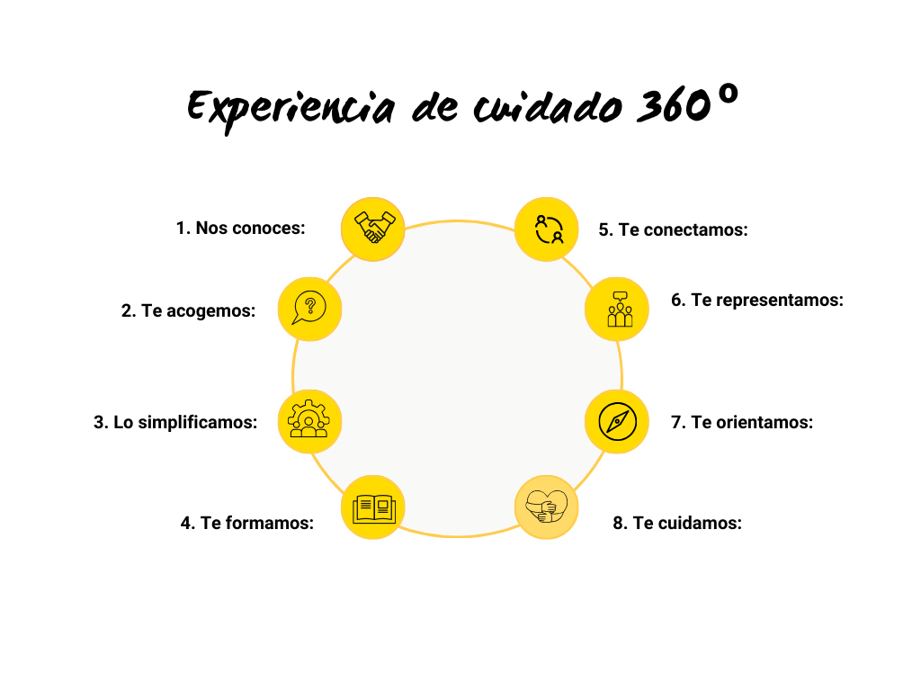 - Nueva experiencia de cuidado 360º: Este circulo resumía las 6 etapas más importantes que las colegiadas pueden experimentar en el colegio, danto al usuario la bienvenida destacando los servicios y contenidos.