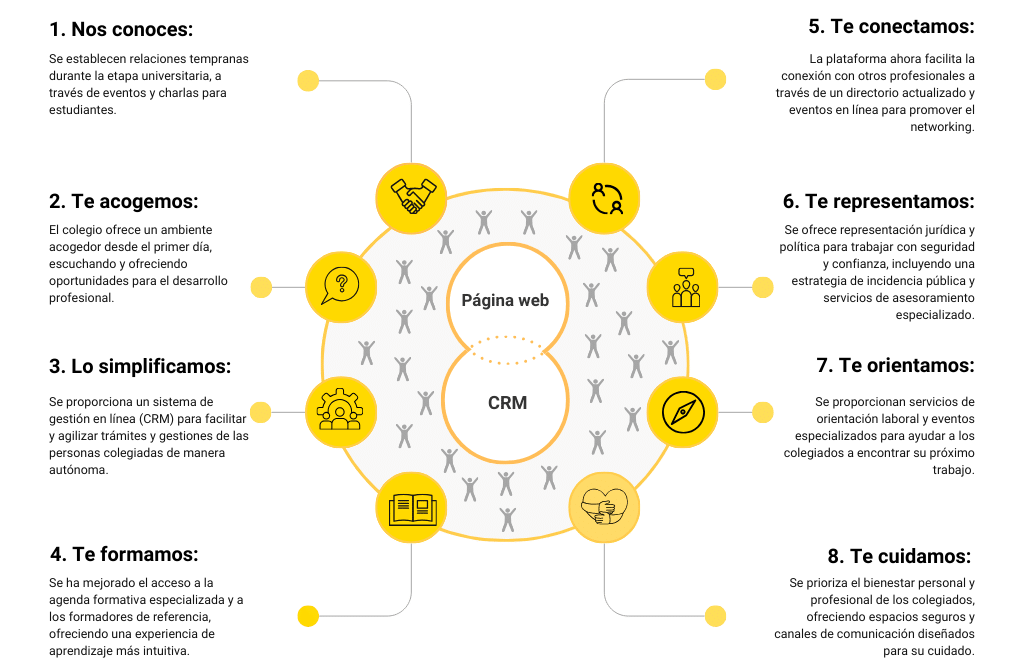 El colegio se comprometió a crear una experiencia de cuidado 360º que aportara valor a las colegiadas en las distintas fases de su carrera profesional. Esto se logró ofreciendo una experiencia integral a través de una serie de servicios y recursos diseñados para cubrir sus diversas necesidades.
